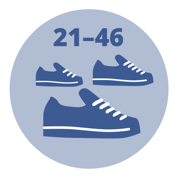 1 koko, joka sopii n. koosta 21 alkaen ainakin kokoon 46.